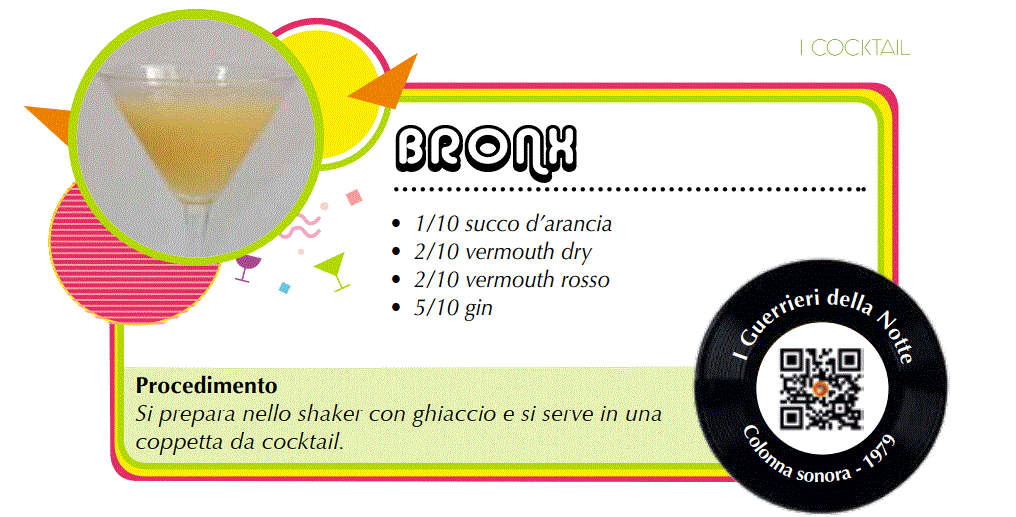 Il cocktail Bronx è un Martini Perfect, ma con l’aggiunta di succo d’arancia. Nel 1934 diventa uno dei cocktail più famosi, menzionato in The World’s 10 Most Famous Cocktails in 1934: veniva subito dopo il Martini (al primo posto) ed il Manhattan (secondo classificato).