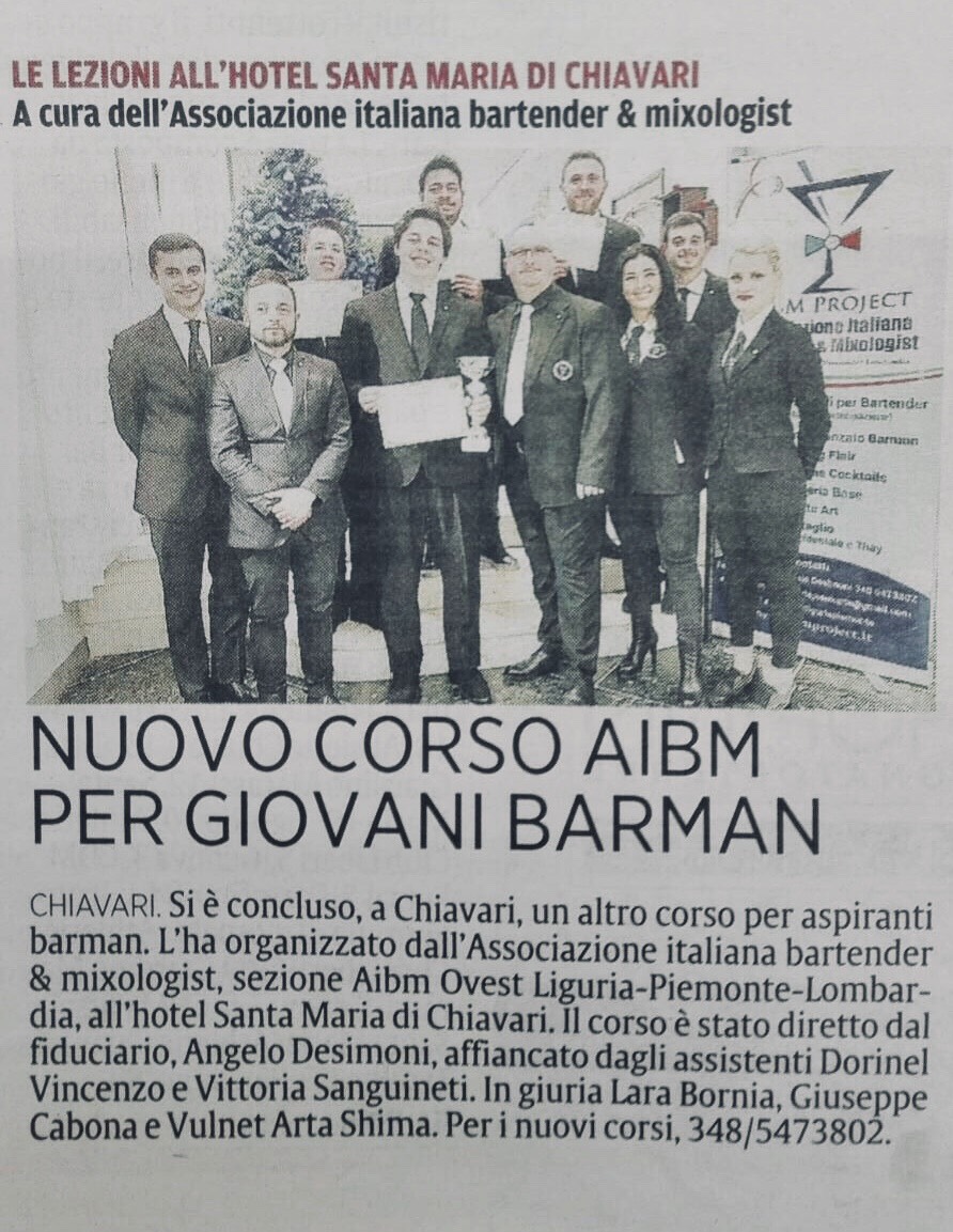 Si è concluso un altro corso per aspiranti Barman, dell’Associazione Italiana Bartender & Mixologist Sezione Aibm Ovest Liguria-Piemonte-lombardia, presso l’Hotel “Santa Maria” di Chiavari.