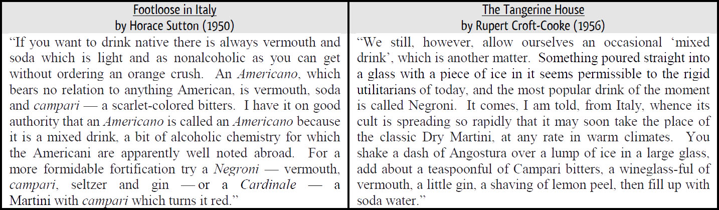 Nel 1950, Horace Sutton pubblicò il suo libro “Footloose in Italy”. Nelle pagine suggerisce un paio di drink nati in Italia: il Negroni e il Cardinale. In genere si narra che un drink chiamato Negroni sia apparso sui testi già nel 1919, ma non è mai stata ritrovata ricetta oppure traccia degli ingredienti. Quando la sua ricetta inizia finalmente ad apparire negli anni ’40 e ’50, c’è una sorpresa: non è il cocktail che conosciamo oggi. Era un CUP.