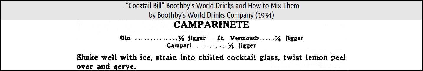 Ma prima che comparissero sia il Negroni ed il Cardinale, vi era un altro cocktail: il Camparinete. Appare in un libro di San Francisco pubblicato nel 1934 dalla Boothby’s World Drinks Company ed attribuito a William Boothby (anche se era morto nel 1930).