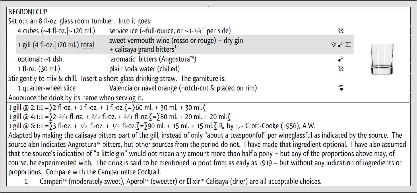 Il Negroni citato da Sutton è composto da “vermouth, Campari [sic], seltzer e gin”. Dal modo in cui lo propone, mettendo come primo ingrediente il vermouth, pare che sia questa la base, e quindi la bevanda è da considerare un CUP. Il Negroni di Croft-Cooke nemmeno a spiegarlo: è un Cup anch’esso. Contiene solo “un po ‘di gin” e “circa un cucchiaino da tè di Campari bitter”, ma un bicchiere pieno (2 fl-oz.) di vino vermouth, che è ovviamente la base di questa categoria di dink.