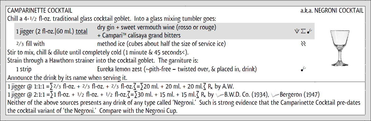 Il Camparinete Cocktail del 1934 è formato da mezzo jigger (1 fl-oz.) di gin, modificato con un quarter-jigger (1/2 fl-oz.) di vino vermouth dolce (noto anche come ‘vermouth italiano’ o rosso) e bitter con un quarter-jigger (1/2 fl-oz.) di Cinchona bitter di marca Campari. Si raffredda con ghiaccio metodo e si filtra in un bicchiere per cocktail di vetro. La guarnizione è una scorza di limone grattugiata. Dovrebbe sembrare familiare a tutti i cosiddetti appassionati di Negroni, anche se il nome non lo è.