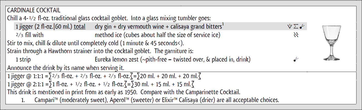 Se rileggiamo di nuovo il pezzo di Sutton, noteremo che descrive il Cardinale come “un Martini con campari [sic] che lo fa diventare rosso”. Questo somiglia alla descrizione dei Negroni attuali. Ma la descrizione di Sutton della tonalità del colore suggerisce – e altre fonti del periodo lo confermano – che il vermouth dry è quello che andrebbe nel Cardinale.